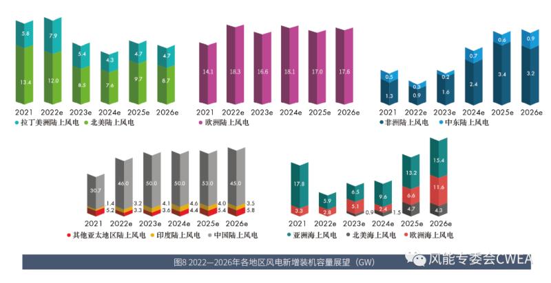 圖8 2022—2026年各地區(qū)風(fēng)電新增裝機容量展望(GW)