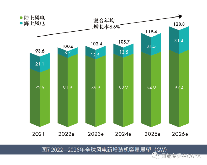隨著各國紛紛宣布自己的凈零排放時間表,以及迫切希望保障能源安全,對全球風(fēng)電產(chǎn)業(yè)的未來發(fā)展預(yù)期日趨積極,2022―2026年的復(fù)合年均增長率(CAGR)有望達(dá)到6.6%。