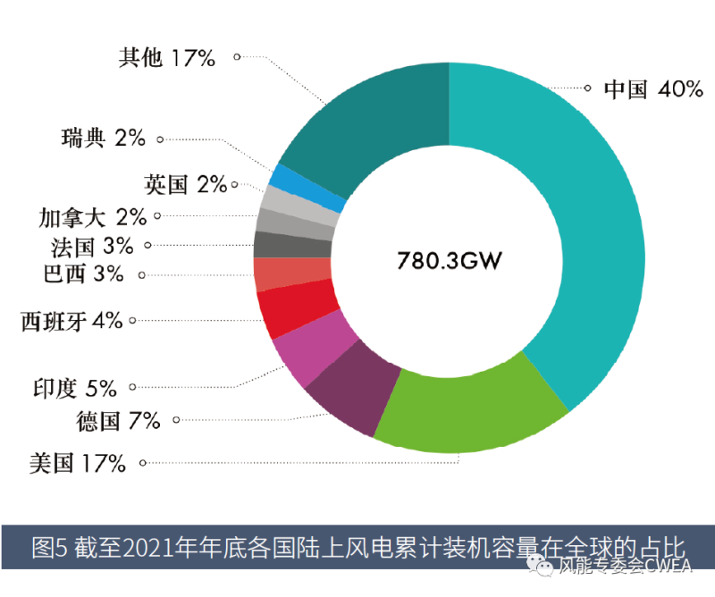 圖5 截至2021年年底各國陸上風(fēng)電累計裝機容量在全球的占比