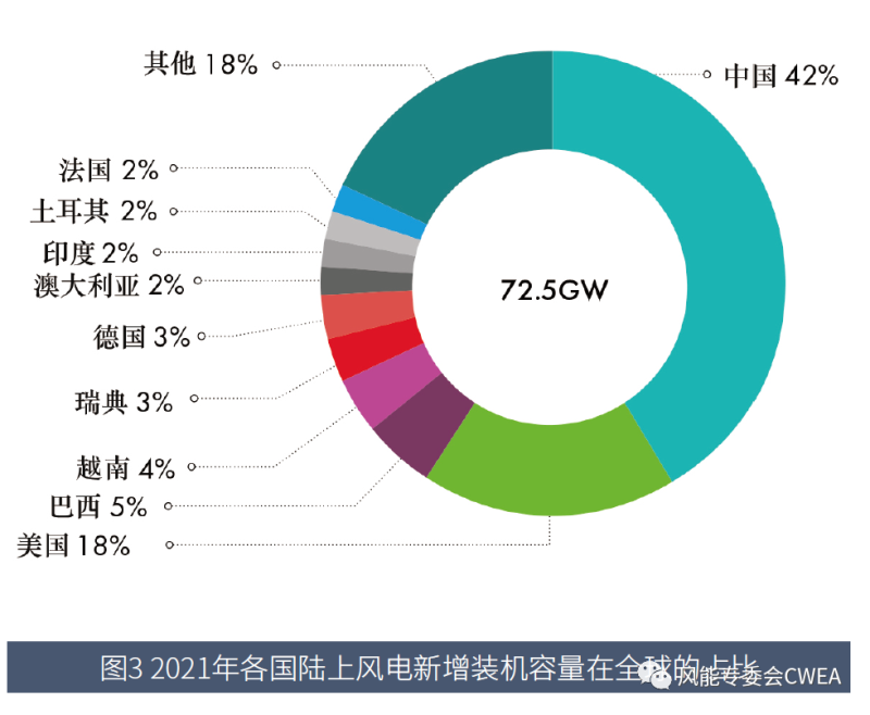 圖3 2021年各國陸上風(fēng)電新增裝機容量在全球的占比