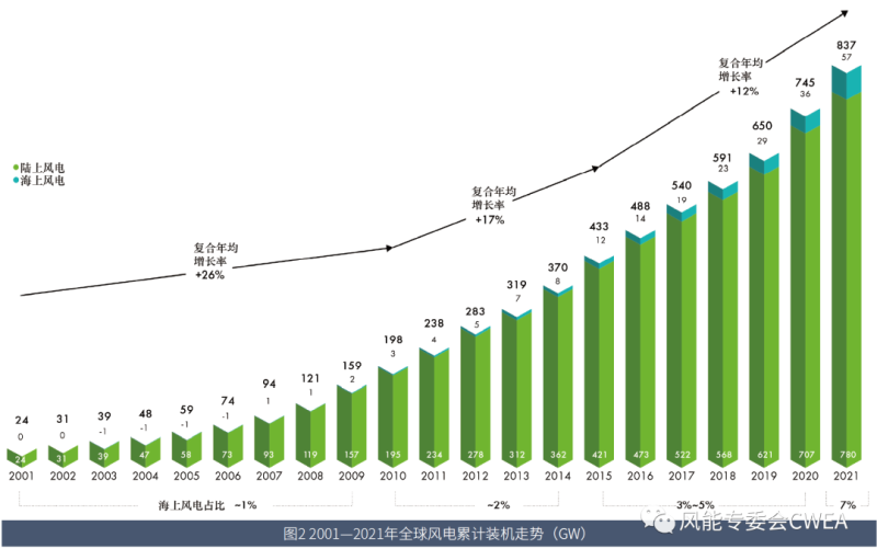 圖2 2001—2021年全球風(fēng)電累計裝機走勢(GW)