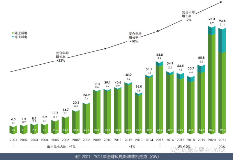 雖然2021年全球陸上風(fēng)電市場發(fā)展勢頭有所減弱,但72.5GW的新增裝機容量仍為歷史第二高水平。全年海上風(fēng)電新增裝機容量超過21GW,是上一年的3倍多,創(chuàng)下歷史新高。
