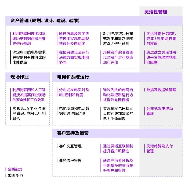 軟實(shí)力是價(jià)值實(shí)現(xiàn)的必要條件。在推動(dòng)基礎(chǔ)要素升級(jí)的同時(shí),電網(wǎng)企業(yè)需要著力打造駕馭新型電力系統(tǒng)的運(yùn)營(yíng)架構(gòu)和能力體系。埃森哲建議電網(wǎng)企業(yè)可以借助國(guó)際先進(jìn)電網(wǎng)企業(yè)的運(yùn)營(yíng)能力框架,圍繞資產(chǎn)管理、現(xiàn)場(chǎng)作業(yè)、電網(wǎng)和系統(tǒng)運(yùn)行、客戶支持及運(yùn)營(yíng)等領(lǐng)域多管齊下,系統(tǒng)分析并逐一梳理各項(xiàng)業(yè)務(wù)在新型電力系統(tǒng)建設(shè)要求下的提升方向和優(yōu)化需求。