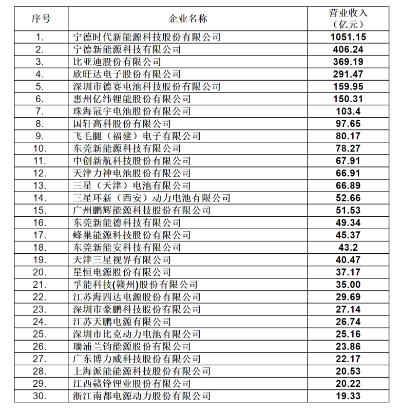 按照營(yíng)業(yè)收入(僅統(tǒng)計(jì)鋰離子電芯及動(dòng)力用、消費(fèi)類產(chǎn)品用和儲(chǔ)能用鋰離子電池模組或系統(tǒng))排序,30家企業(yè)2021年?duì)I業(yè)收入為3559億元。其中,寧德時(shí)代新能源科技股份有限公司以1051億元營(yíng)業(yè)收入位居第一,寧德新能源科技有限公司以406億元營(yíng)業(yè)收入排名第二,比亞迪股份有限公司以369億元營(yíng)業(yè)收入排名第三。30家鋰離子電池企業(yè)名單如下: