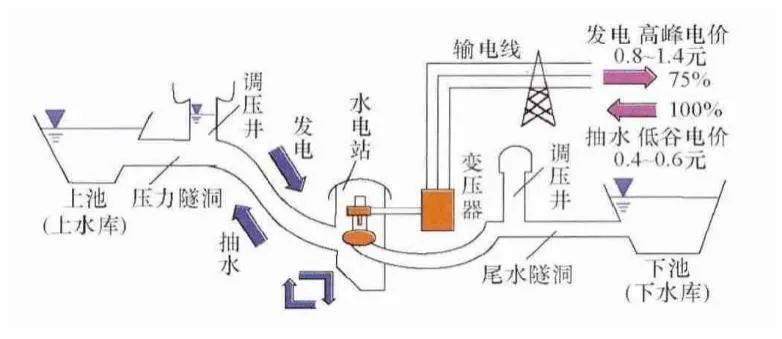 抽水蓄能的工作原理是利用可逆的水泵水輪機(jī)組,在電力負(fù)荷低谷時利用多余電能將下水庫中的水抽到上水庫儲存起來,在電力負(fù)荷高峰時放水發(fā)電。抽水蓄能電站由上下水庫、引水系統(tǒng)(高壓部分和低壓部分)、電站廠房和機(jī)組等構(gòu)成。理論來說,水量和落差越大,儲能就越多。
