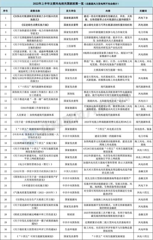 在2022年上半年新發(fā)布的國家級政策中,《2022年能源工作指導意見》著重提出要開展深遠海風電建設(shè)示范,穩(wěn)妥推動海上風電基地建設(shè)。積極推進水風光互補基地建設(shè);在《北部灣城市群建設(shè)“十四五”實施方案》中提出,加快構(gòu)建多元化低碳清潔能源體系,建設(shè)北部灣海上風電基地的建議。