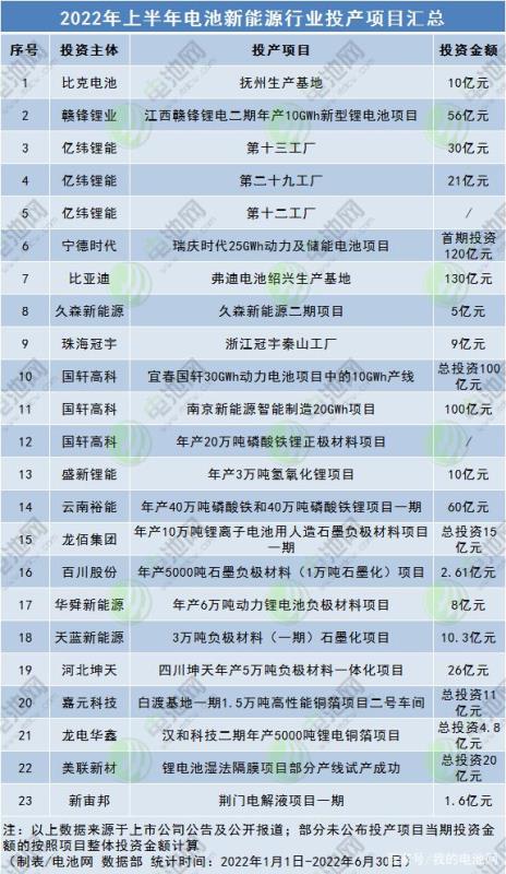 根據(jù)上市公司公告及公開報道梳理了2022年上半年電池新能源產(chǎn)業(yè)鏈項目開工投產(chǎn)情況,不完全統(tǒng)計下,開工項目85個,總投資金額超5914億元;投產(chǎn)項目23個,總投資金額逾750億元。