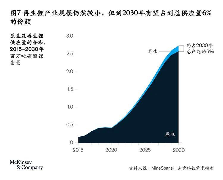 鋰離子電池能否回收,已成為一個(gè)人們普遍關(guān)心的問題。乘用車電池的預(yù)期壽命為10到15年,加上儲(chǔ)能行業(yè)有利用廢棄電動(dòng)汽車電池的可行性,在本世紀(jì)第二個(gè)十年期間,電池回收利用率有望提升,但達(dá)不到顛覆現(xiàn)有格局的程度。通過不同回收工藝,廢棄電池中的鋰回收率將介于0到80%之間。到2030年,再生鋰有望在總產(chǎn)量中占到略高于6%的份額(見圖7)。