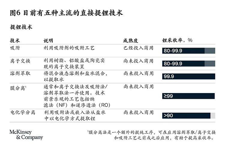 目前僅有吸附法DLE技術(shù)在阿根廷和中國(guó)投入商用。如果DLE技術(shù)能得到大規(guī)模推廣,并應(yīng)用于各種鹵水項(xiàng)目,將能通過提高采收率、降低運(yùn)營(yíng)成本等優(yōu)化現(xiàn)有產(chǎn)能,同時(shí)改善項(xiàng)目的環(huán)境影響(見圖6)。