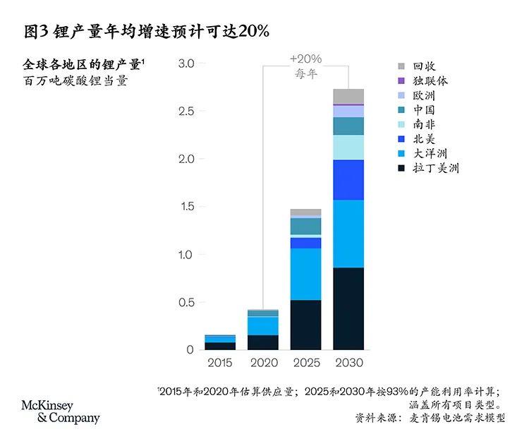 目前,幾乎所有的鋰礦開采都集中在澳大利亞、拉丁美洲和中國(guó),2020年的總產(chǎn)量占到全球的98%。一批即將上馬的項(xiàng)目很可能帶來新的玩家,并將鋰礦開采的版圖拓展至西歐、東歐、俄羅斯及其他獨(dú)聯(lián)體(CIS)國(guó)家。這些產(chǎn)能應(yīng)該足以推動(dòng)供應(yīng)量以每年20%的速度增長(zhǎng),到2030年達(dá)到270多萬(wàn)噸LCE(見圖3)。