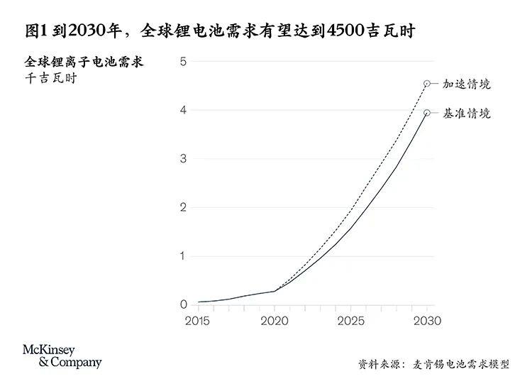 麥肯錫預(yù)計(jì),今后十年,鋰離子電池市場(chǎng)將以約30%的年均復(fù)合增長(zhǎng)率持續(xù)增長(zhǎng)。到2030年,電動(dòng)汽車、儲(chǔ)能系統(tǒng)、電動(dòng)自行車、電動(dòng)工具及其他電池密集型應(yīng)用場(chǎng)景有望總共產(chǎn)生4000~4500吉瓦時(shí)的鋰離子電池需求(見圖1)。