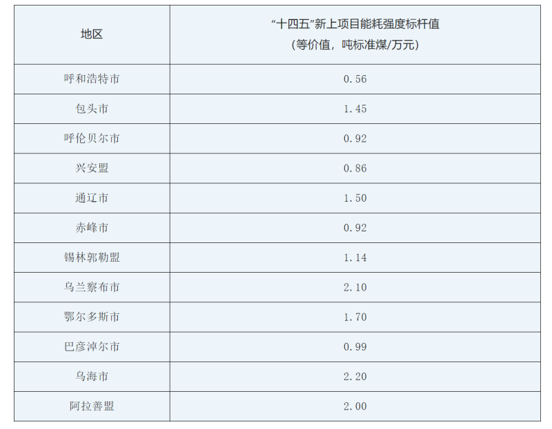 各盟市“十四五”新上項(xiàng)目能耗強(qiáng)度標(biāo)桿值