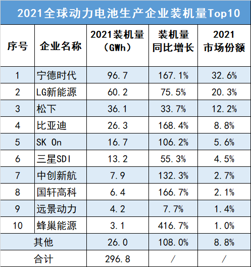 億歐智庫數(shù)據(jù)顯示,2021年全球動力電池裝機量排行榜前十名分別為寧德時代、LG新能源、松下、比亞迪、SKOn、三星SDI、中創(chuàng)新航(中航鋰電)、國軒高科、遠景動力、蜂巢能源。其中,寧德時代2021年電池裝機量達到96.7吉瓦時,位列全球電池企業(yè)第一。