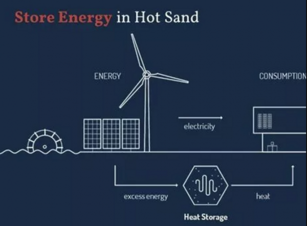 沙子電池,顧名思義,就是一種用沙子來儲(chǔ)能的裝置。當(dāng)風(fēng)能和太陽能過剩時(shí),將用它們來加熱電阻,使得沙子的溫度達(dá)到500攝氏度,從而產(chǎn)生熱空氣。與此同時(shí),熱交換器的存在使得熱空氣可以在沙子中不斷循環(huán)。