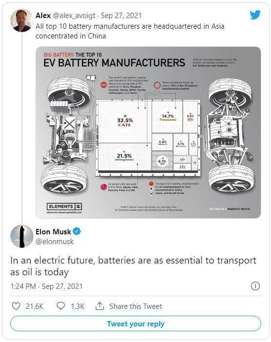 當(dāng)天早些時(shí)候,風(fēng)投基金Craft Ventures普通合伙人大衛(wèi)·薩克斯(David Sacks)在推特上稱,沒(méi)有能源的獨(dú)立,就沒(méi)有安全。埃?。R斯克在該條推文下回復(fù)稱,“絕對(duì)的。鋰電池就是新的石油?!?