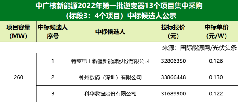標(biāo)段3第一中標(biāo)候選人為特變電工新疆新能源股份有限公司,投標(biāo)報(bào)價(jià)為32806350元,中標(biāo)單價(jià)為0.126元/W;第二中標(biāo)候選人為神州數(shù)碼(深圳)有限公司,投標(biāo)報(bào)價(jià)為33866448元,中標(biāo)單價(jià)為0.130元/W;第三中標(biāo)候選人為科華數(shù)據(jù)股份有限公司,投標(biāo)報(bào)價(jià)為31689900元,中標(biāo)單價(jià)為0.122元/W。