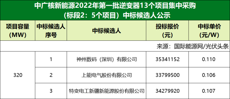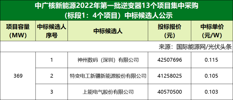 標(biāo)段1第一中標(biāo)候選人為神州數(shù)碼(深圳)有限公司,投標(biāo)報(bào)價(jià)為42507696元,中標(biāo)單價(jià)為0.115元/W;第二中標(biāo)候選人為特變電工新疆新能源股份有限公司,投標(biāo)報(bào)價(jià)為41258025元,中標(biāo)單價(jià)為0.105元/W;第三中標(biāo)候選人為上能電氣股份有限公司,投標(biāo)報(bào)價(jià)為40570500元,中標(biāo)單價(jià)為0.103元/W。