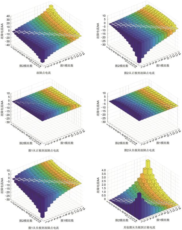 根據(jù)以上計(jì)算方法,計(jì)算出簇1和簇2不同模組位置故障點(diǎn)短路(簇首端或者末端故障相當(dāng)于簇內(nèi)短路,這里不考慮),短路電流變化三維柱狀圖如圖8所示(詳細(xì)數(shù)據(jù)見(jiàn)附錄A)。