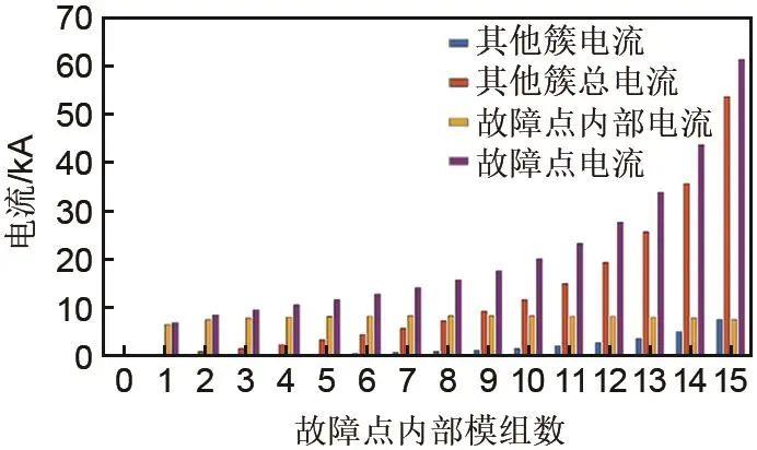 (2)其他簇提供的故障電流逐漸增大,當(dāng)故障點(diǎn)內(nèi)模組數(shù)為15即在簇首末端發(fā)生故障時(shí),其他簇提供的故障電流與故障點(diǎn)內(nèi)故障電流相同,此時(shí)的電流即為故障點(diǎn)外部最大故障電流7.67 kA;