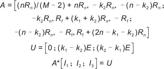 以下以簇1和簇2之間發(fā)生簇間短路為例分析短路計(jì)算方法,其他簇間短路故障計(jì)算方法與之類似。設(shè)總簇?cái)?shù)為M,每一簇n個(gè)電池,簇1短路點(diǎn)到正極k1個(gè)電池,簇2短路點(diǎn)到正極k2個(gè)電池,其中k1<n,k2<n;每個(gè)電池內(nèi)電動(dòng)勢(shì)為E,內(nèi)阻Rn,故障電阻Rf。其他所有簇流入正極電流為I1,簇2流入正極電流為I2,負(fù)極流入簇2電流為I3。根據(jù)電路列出回路電流法方程為: