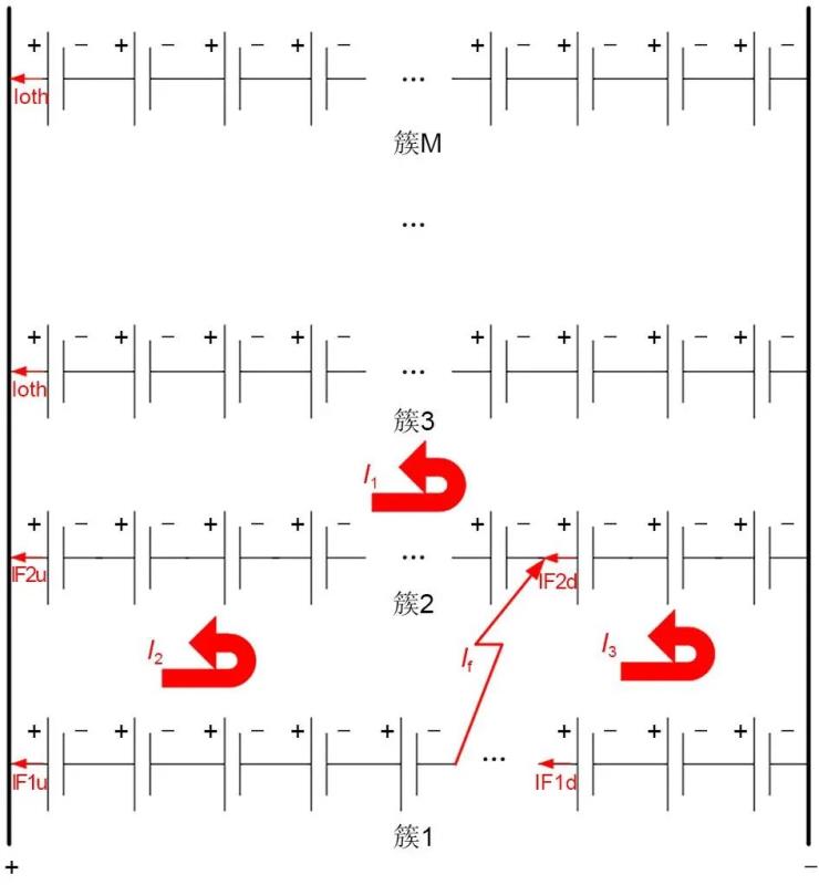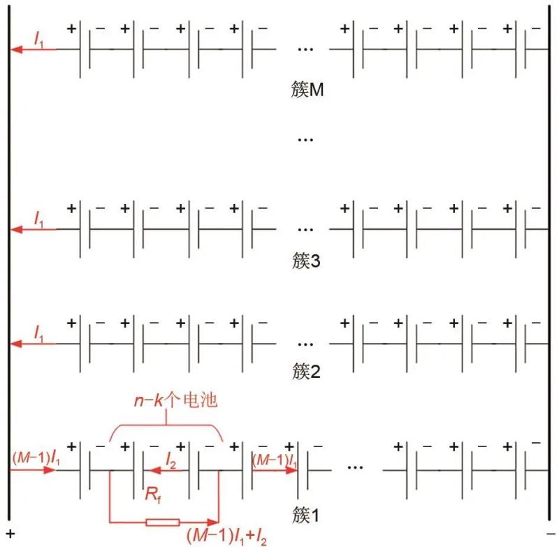 如圖5所示發(fā)生的簇內(nèi)短路故障,設(shè)總簇?cái)?shù)為M,每一簇n個(gè)電池,短路點(diǎn)外k個(gè)電池,即短路點(diǎn)內(nèi)n-k個(gè)電池之間發(fā)生故障,其中k<n;每個(gè)電池內(nèi)電動(dòng)勢(shì)為E,內(nèi)阻Rn,故障電阻Rf;設(shè)非故障簇每一簇提供故障電流為I1,故障簇內(nèi)部故障電流為I2,電流方向都是流向故障點(diǎn)。忽略其他線阻。