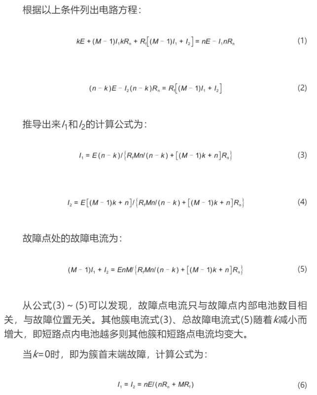 本文從電池短路模型入手,推導(dǎo)各種短路情況下電池系統(tǒng)各處短路電流理論計(jì)算公式,并在理論計(jì)算公式基礎(chǔ)上,分析影響短路電流大小的因素,并提出基于熔斷器的保護(hù)配置方案。