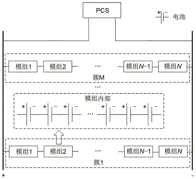 大型儲(chǔ)能電站的基本結(jié)構(gòu)是由若干節(jié)電池串聯(lián)形成電池模組,若干個(gè)電池模組串聯(lián)形成電池簇,電池簇并聯(lián)形成電池堆而形成,示意圖如圖4所示。