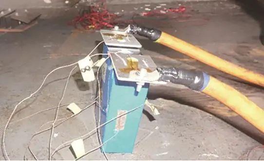 為了驗(yàn)證模型的準(zhǔn)確性,采用280 Ah單節(jié)電池做短路實(shí)驗(yàn),電池滿充電壓3.65 V,直流內(nèi)阻0.4 mΩ?,F(xiàn)場(chǎng)將電池正負(fù)極直接經(jīng)電纜和短路機(jī)連接,其阻抗和約為1.8 mΩ?,F(xiàn)場(chǎng)實(shí)驗(yàn)照片如圖2所示。