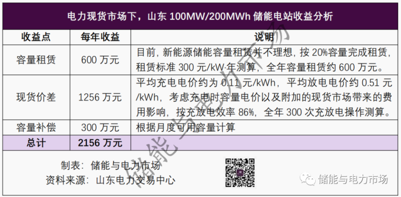 根據(jù)此次介紹,山東省一個100MW/200MWh的儲能電站,目前可獲的收益來自三大塊:容量租賃費用、現(xiàn)貨市場價差收益、容量補償費用,如下表所示。