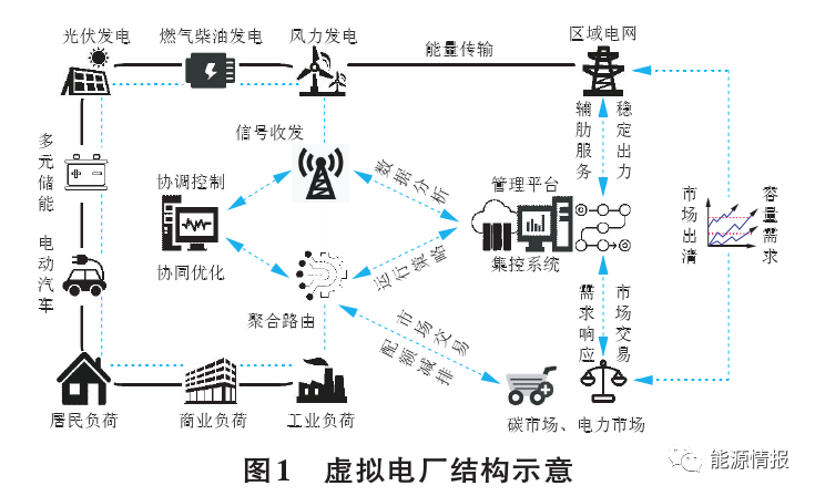 虛擬電廠內(nèi)部通過信息技術(shù)將發(fā)電、用電、儲能等資源進(jìn)行梳理聚合,與外部集控系統(tǒng)、管理平臺配合進(jìn)行協(xié)同控制、協(xié)同優(yōu)化,實(shí)現(xiàn)數(shù)據(jù)分析、運(yùn)行策略調(diào)整。虛擬電廠對外進(jìn)行能量傳輸,根據(jù)市場變化需求進(jìn)行碳市場、電力市場交易。因此,可以將虛擬電廠理解為一種能發(fā)揮電廠作用的某種“黑匣子”,它不需要新建一個電廠,但是對外既可以作為“正電廠”向系統(tǒng)供電,也可以作為“負(fù)電廠”接收系統(tǒng)的電力。“黑匣子”包含分布式電源、多元儲能設(shè)施、電動汽車、可控負(fù)荷等資源。但只有這些資源還不足以使之成為有效的能源系統(tǒng),虛擬電廠還需要一套技術(shù)和系統(tǒng)來將它們智能的聚合起來。