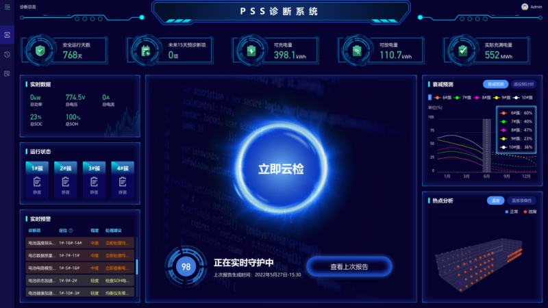 PSS系統(tǒng)支持“云邊結(jié)合”,從電芯數(shù)據(jù)中抓取容量、內(nèi)阻和自放電參數(shù)等反映電芯性能特征的電池關(guān)鍵性能參數(shù),并基于對(duì)衰老過程中鋰電池關(guān)鍵性能參數(shù)變化規(guī)律和電池知識(shí)地貌的分析,預(yù)測電芯狀態(tài)演變,能夠捕捉電池關(guān)鍵參數(shù)劣化的微先兆。針對(duì)電芯內(nèi)短路熱失控、正常老化失效等故障,提前一個(gè)月就做出預(yù)警,全方位保證移動(dòng)儲(chǔ)能多功能補(bǔ)電車用電安全。