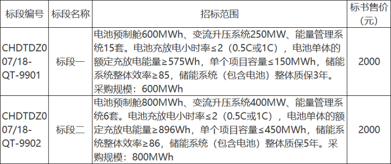 標(biāo)段二采購規(guī)模:800MWh,電池預(yù)制艙800MWh、變流升壓系統(tǒng)400MW、能量管理系統(tǒng)6套。電池充放電小時率≤2(0.5C或1C),電池單體的額定充放電能量≥896Wh,單個項目容量≤450MWh,儲能系統(tǒng)整體效率≥86,儲能系統(tǒng)(包含電池)整體質(zhì)保5年。