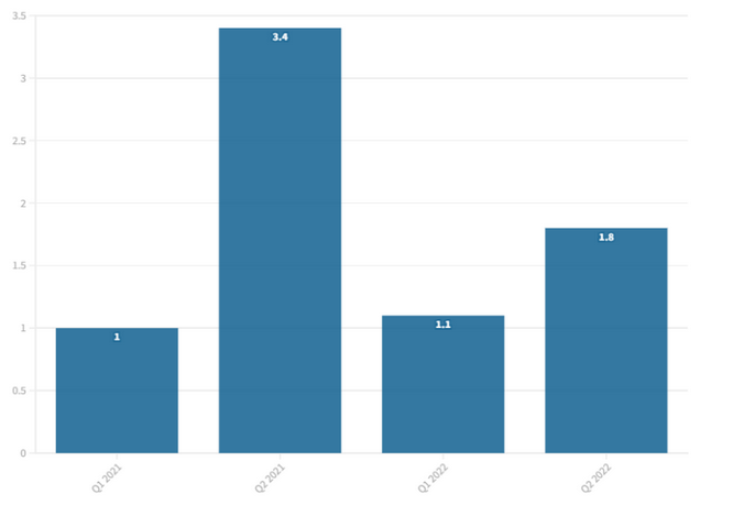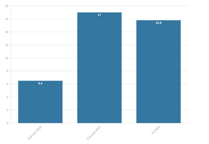 在2022年第一季度表現(xiàn)強勁之后,第二季度增長相對減緩。2022年的上半年總額為158億美元,其中2022年第一季度為129億美元。