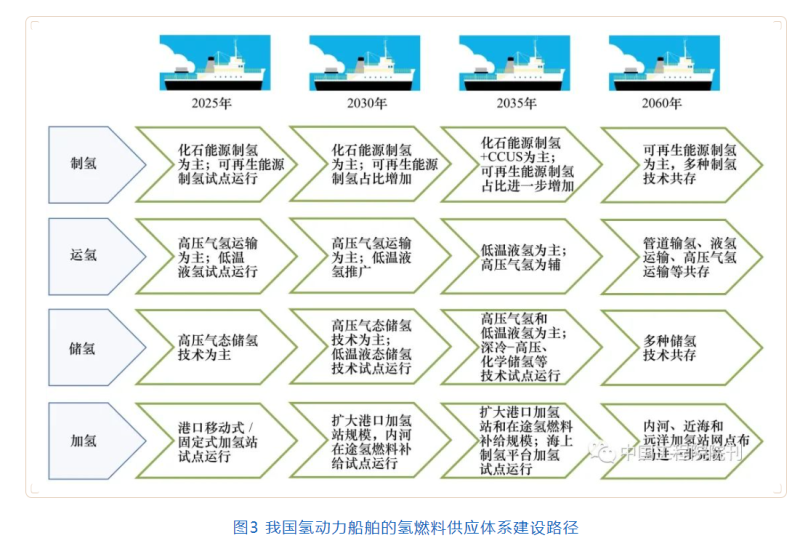 氫動力船舶應用必然要經(jīng)歷從示范應用到擴大部署再到商業(yè)化應用的發(fā)展過程,預計2030年前的氫動力船舶應用率仍較低。目前我國水路交通相關的氫能基礎設施基本空白,從發(fā)展效率的角度考慮,可借助陸上氫燃料電池汽車快速發(fā)展的勢頭,統(tǒng)籌考慮陸路交通、水路交通的氫能基礎設施布局與規(guī)劃,適度超前開展港口、碼頭的加氫站建設布局,由此促進氫動力船舶的高效率發(fā)展。