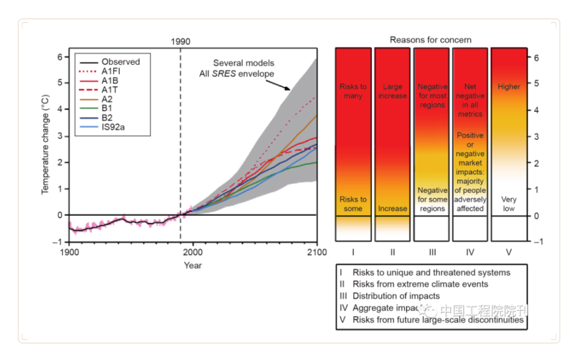 值得關(guān)注的是,TAR引入了5個“關(guān)切理由”(reasonsfor concern),“概念性”地表達了重視氣候變化風險的原因(圖1)包括:獨特和瀕危系統(tǒng)的風險、極端天氣氣候事件風險、影響的分布、綜合影響,以及未來大規(guī)模突發(fā)事件的風險。該圖用全球年平均溫度代表氣候變化的強度,但特別指出未來的影響將是全球和區(qū)域平均氣候變化強度、速度、氣候變率和極端氣候現(xiàn)象、社會和經(jīng)濟狀況以及適應性的函數(shù),其取決于多個方面。報告認為,設定避免“氣候系統(tǒng)受到危險的人為干擾”水平的戰(zhàn)略、目標和時間表時,需要考慮氣候、生態(tài)和社會經(jīng)濟系統(tǒng)存在的慣性和不確定性,從更為綜合和直觀的角度,評估氣候變化可能帶來的風險,并且將其與全球平均溫度相聯(lián)系。如圖1所示,雖然TAR沒有明確提出什么樣的溫升應該成為“氣候系統(tǒng)受到危險的人為干擾”的指標,但顯示4°C以上的溫升將帶來極大的風險。這5個“關(guān)切理由”在IPCC的后續(xù)評估中被不斷使用。