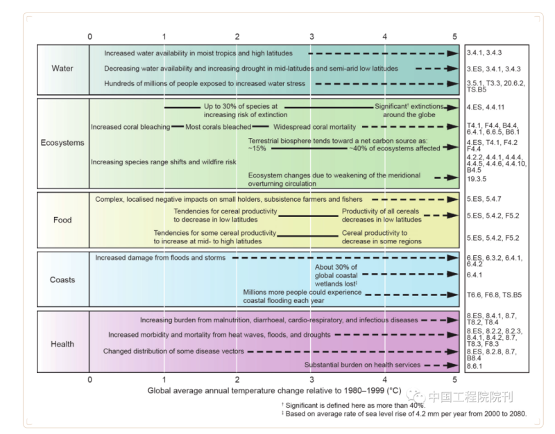 圖2. IPCC AR4中與全球平均溫度變化有關(guān)的影響實例。