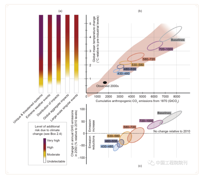 圖3. 到2050年,氣候變化、溫度變化、累積的二氧化碳排放量以及溫室氣體年排放量變化等風險之間的關(guān)系:(a)限制關(guān)切理由中的風險;(b)意味著限制CO2 累積排放量;(c)可在未來幾十年限制溫室氣體年排放量。