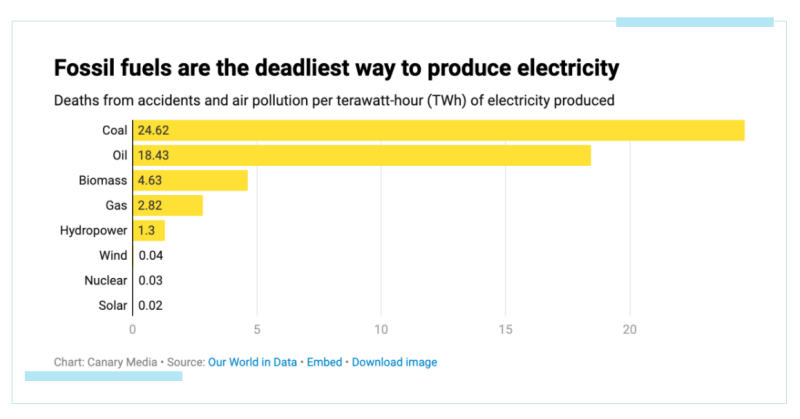 中國儲能網(wǎng)訊:我們說化石燃料是致命的,這不僅僅是因為它們導致了氣候危機。每單位發(fā)電量中,煤炭和石油造成的死亡人數(shù)遠遠超過可再生能源或核能——這只是計算空氣污染和事故造成的死亡人數(shù),而沒有計入氣候變化引發(fā)的災害造成的死亡人數(shù)。