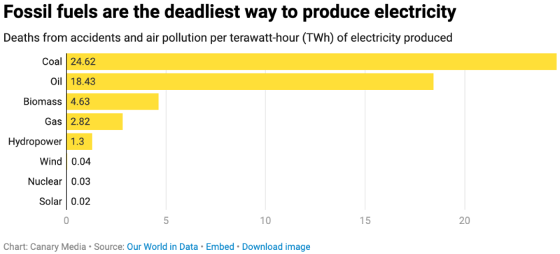 中國(guó)儲(chǔ)能網(wǎng)訊:我們說化石燃料是致命的,這不僅僅是因?yàn)樗鼈儗?dǎo)致了氣候危機(jī)。每單位發(fā)電量中,煤炭和石油造成的死亡人數(shù)遠(yuǎn)遠(yuǎn)超過可再生能源或核能——這只是計(jì)算空氣污染和事故造成的死亡人數(shù),而沒有計(jì)入氣候變化引發(fā)的災(zāi)害造成的死亡人數(shù)。