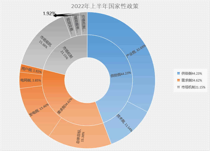 2022年上半年,共發(fā)布國家性政策52項,供給側(cè)相關(guān)政策共23項,其中產(chǎn)業(yè)側(cè)相關(guān)政策占比居多,共17個,鼓勵技術(shù)側(cè)發(fā)展的政策有6項;需求側(cè)政策18項,市場機制相關(guān)政策11項。