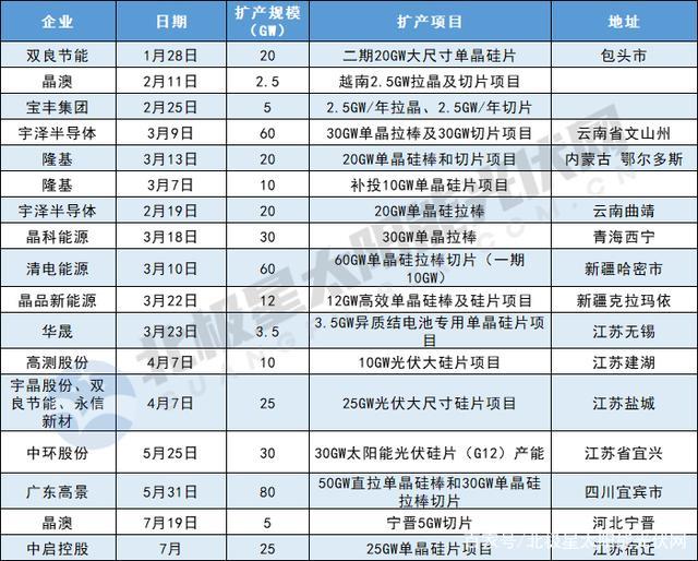 在今年宣布擴(kuò)產(chǎn)的十家企業(yè)中,除了老玩家特變電工以外,市場迎來了九家跨界而來企業(yè)的投資簇?fù)怼F渲?,寶豐集團(tuán)投資規(guī)模最大,擴(kuò)產(chǎn)規(guī)劃達(dá)30萬噸;特變電工、合盛硅業(yè)緊隨其后,擴(kuò)產(chǎn)規(guī)劃均達(dá)20萬噸;硅片龍頭中環(huán)股份擴(kuò)產(chǎn)規(guī)模達(dá)12萬噸;中來股份、上機(jī)數(shù)控、亞王能源集團(tuán)擴(kuò)產(chǎn)規(guī)模均達(dá)10萬噸,吉利科技、南玻A擴(kuò)產(chǎn)規(guī)模均達(dá)5萬噸。