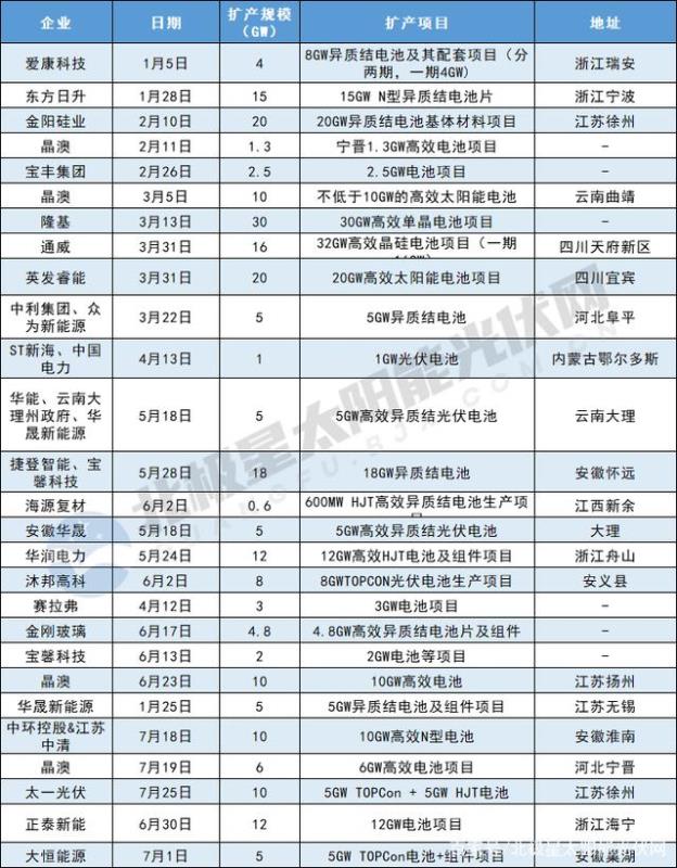在異質(zhì)結(jié)擴(kuò)產(chǎn)隊(duì)伍中,金陽硅業(yè)布局了20GW異質(zhì)結(jié)電池基體材料,項(xiàng)目已于2月初開工,預(yù)計(jì)2023年全面投產(chǎn)。捷登智能和寶馨科技、東方日升、華潤電力擴(kuò)產(chǎn)規(guī)模分別達(dá)12GW及以上。其他,如老牌玩家愛康科技、華晟新能源紛紛祭出4GW及以上的擴(kuò)產(chǎn)規(guī)劃;跨界而來的金剛玻璃布局了4.8GW異質(zhì)結(jié)電池片及組件外;華潤、華能等央國企和大理州政府也在積極參與布局。