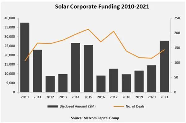 碳中和為光伏行業(yè)鋪好了長(zhǎng)達(dá)30年的黃金發(fā)展期,長(zhǎng)坡厚雪,行業(yè)空間和成長(zhǎng)性毋庸置疑。2021年,全球太陽能行業(yè)企業(yè)融資總額(包括風(fēng)險(xiǎn)投資和私募股權(quán)、債務(wù)融資和公開市場(chǎng)融資)達(dá)到278億美元,同比增長(zhǎng)了91%,創(chuàng)下10年來最高紀(jì)錄。這項(xiàng)數(shù)據(jù)是市場(chǎng)繁榮的信號(hào),但也可能是供過于求的伏筆。