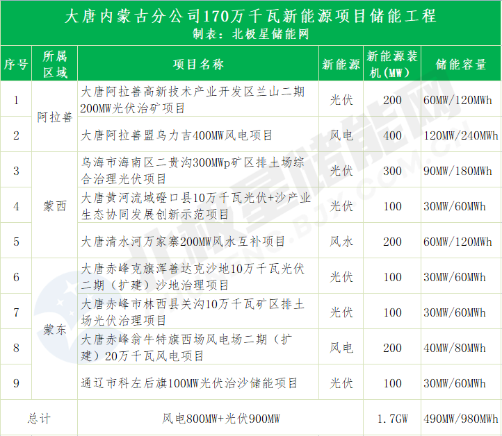 中國儲能網(wǎng)訊:8月1日,大唐集團發(fā)布內(nèi)蒙古170萬千瓦新能源項目儲能工程EPC總承包打捆招標,共包括9個新能源項目、裝機容量170萬千瓦,配套建設(shè)儲能容量490MW/980MWh。項目將按照所在區(qū)域劃分為三個標段分別招標。