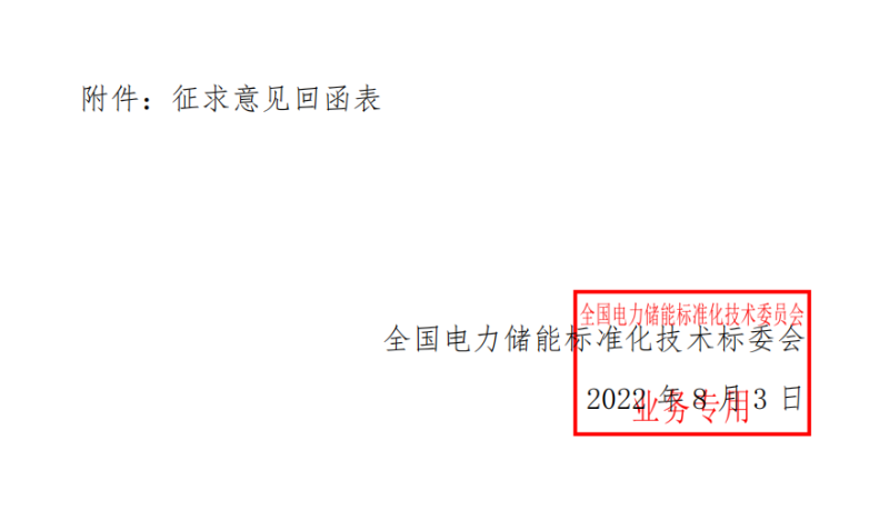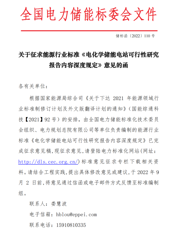 關(guān)于征求能源行業(yè)標(biāo)準(zhǔn)《電化學(xué)儲(chǔ)能電站可行性研究報(bào)告內(nèi)容深度規(guī)定》意見的函