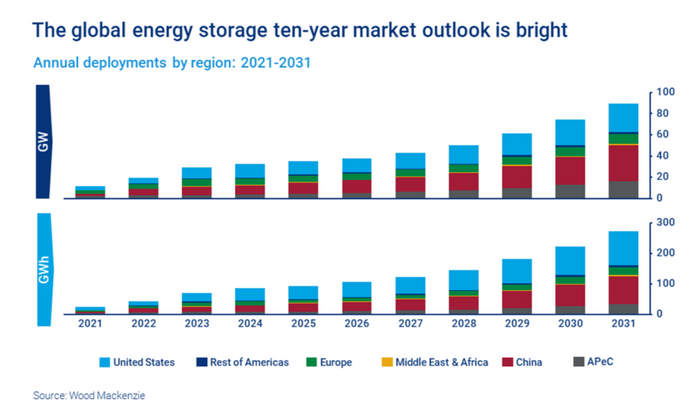 該公司在最新一期的“全球儲能市場展望更新”季度版報告是指出,到2031年,全球儲能市場累計部署的儲能系統總裝機容量將達到500GW,其中美國和中國占到75%。