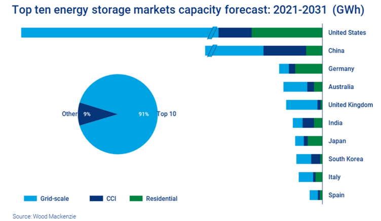 如下圖所示,美國和中國將在2021~2031年主導全球儲能市場,而全球十大市場將占同期新增儲能容量的91%。在德國、印度和日本以外的大多數國家和地區(qū),電網規(guī)模儲能系統將是增長的最主要的部分,其中住宅和商業(yè)和工業(yè)(C&I)的儲能系統將占大部分。