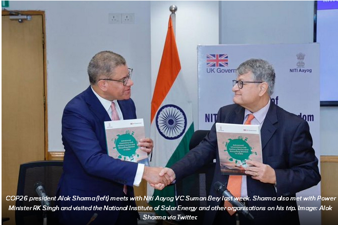上周,英國政治家、COP26大會主席Alok Sharma會見了印度國家研究院(NITI Aayog)首席執(zhí)行官Parameswayan Iyer及其副院長Suman Bery,討論英國和印度在電動汽車以及電池市場的再利用和回收方面的合作。