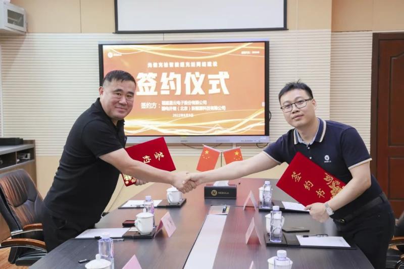 星云股份董事兼總裁劉作斌(右)與國(guó)電許繼(北京)新能源科技有限公司總經(jīng)理?xiàng)罟獯黼p方進(jìn)行合作簽約
