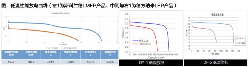 另一個突出優(yōu)勢則是低溫性能好。國海證券研究顯示,錳酸鐵鋰電池在-20℃下容量保持率能夠達(dá)到約75%,而磷酸鐵鋰的容量保持率為60%-70%。